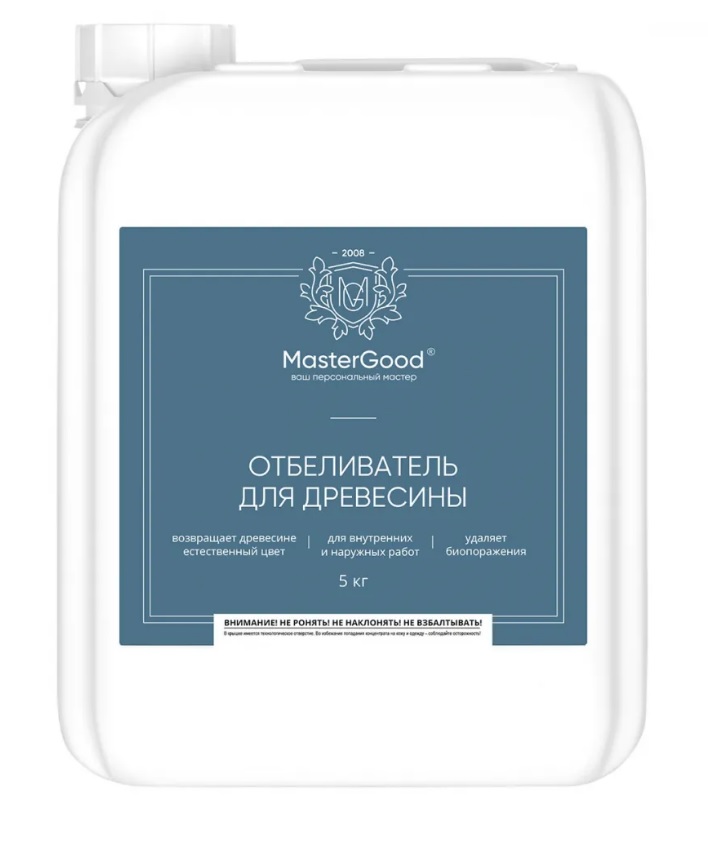 Эффективный отбеливатель для древесины MasterGood предназначен для быстрого удаления деревоокрашивающих и дереворазрушающих грибов, плесени, серого налета, дезинфекции древесины и глубокого осветления потемнений, вызванных атмосферным влиянием.