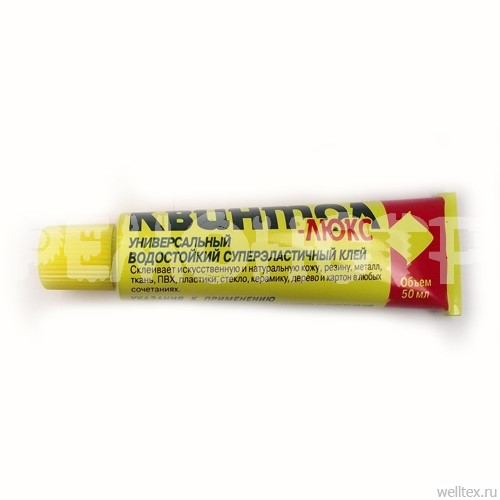 Универсальный клей "Квинтол-Люкс" склеивает искусственную и натуральную кожу, резину, металл, ткань, ПВХ, пластики, стекло, керамику, дерево и картон в любых сочетаниях.